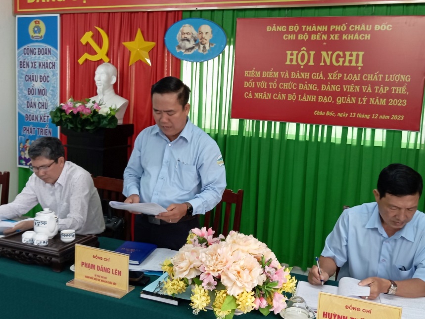 Mở đầu hội nghị, đồng chí Phạm Đăng Lên - Bí thư chi bộ - Giám đốc Bến xe khách Châu Đốc phát biểu khai mạc hội nghị. Định hướng rõ công tác kiểm điểm, đánh giá, xếp loại tổ chức đảng, đảng viên cuối năm nhằm mục đích nêu cao tinh thần tự phê bình và phê bình, tự soi, tự sửa thấy được ưu điểm để phát huy, hạn chế khuyết điểm để khắc phục; chủ động phát hiện ngăn ngừa biểu hiện suy thoái, “tự diễn biến”, “tự chuyển hóa”, tham nhũng, tiêu cực, góp phần nâng cao năng lực lãnh đạo và sức chiến đấu của tổ chức đảng, cán bộ, đảng viên, xây dựng chi bộ trong sạch, vững mạnh; việc kiểm điểm, đánh giá, xếp loại đảm bảo trung thực, công tâm, khách quan, công khai, đạt kết quả thực chất.