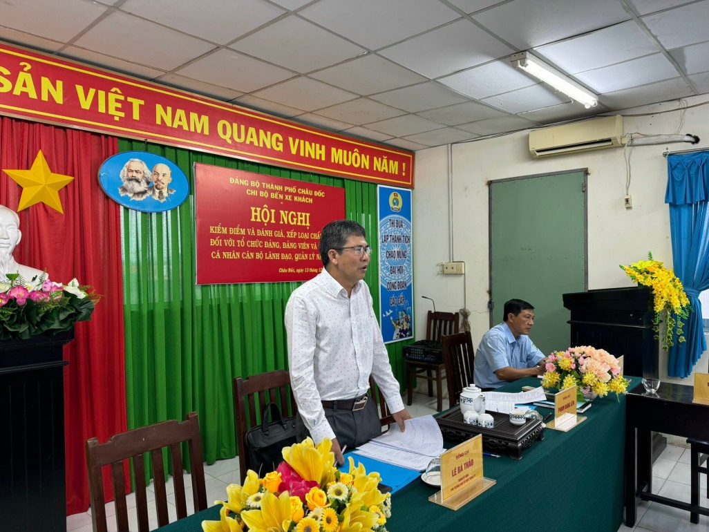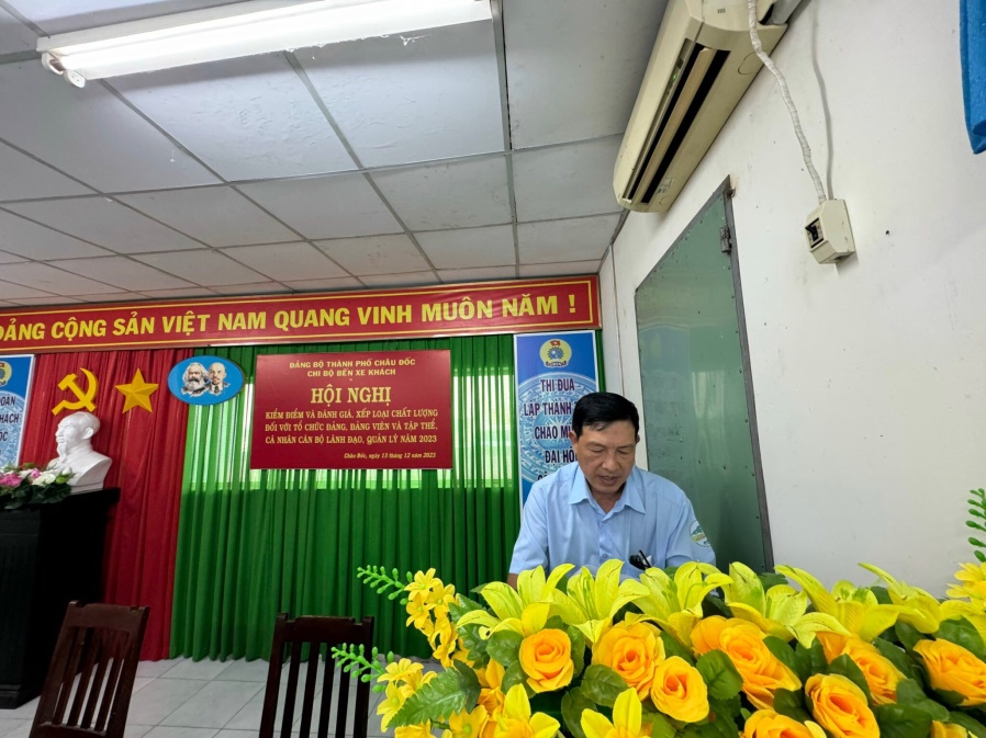 Ngày 13/12/2023, Chi bộ Bến xe khách tổ chức Hội nghị kiểm điểm và đánh giá, xếp loại chất lượng đối với tổ chức đảng, đảng viên và tập thể, cá nhân cán bộ lãnh đạo, quản lý năm 2023 theo Hướng dẫn số 10-HD/BTC của Ban Tổ chức Thành ủy Châu Đốc một số nội dung trong kiểm điểm, đánh giá, xếp loại chất lượng năm 2023 đối với tổ chức đảng, đảng viên và tập thể, cá nhân.