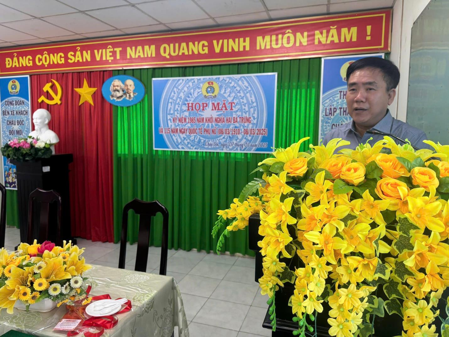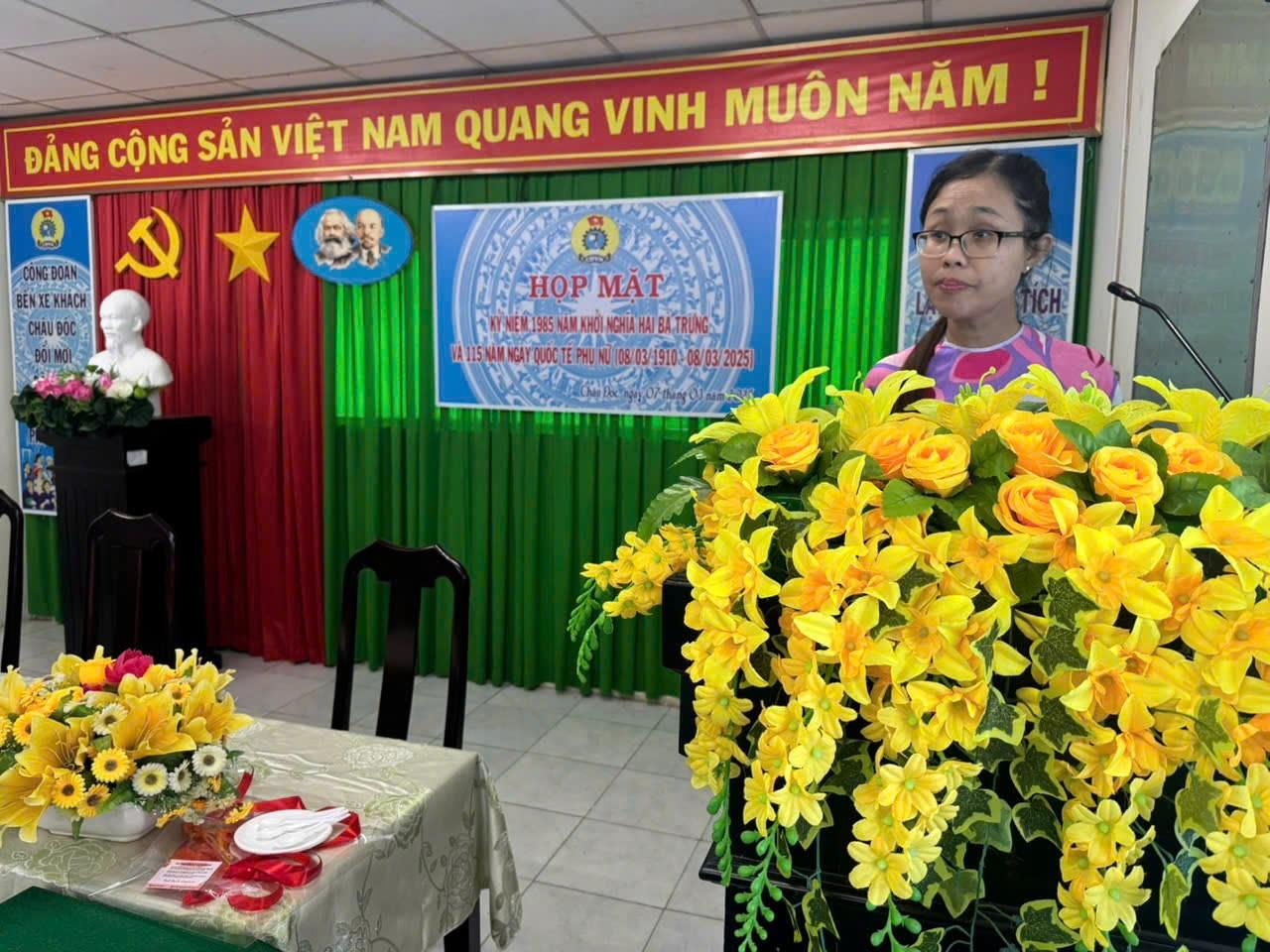 Thực hiện Kế hoạch số 06/KH-CĐCS, ngày 25/02/2025 của Công đoàn cơ sở Bến xe khách tổ chức họp mặt chào mừng kỷ niệm 115 năm ngày Quốc tế phụ nữ 08/3 (08/3/1910 – 08/3/2025). Sáng ngày 07/3/2025, Công đoàn cơ sở Bến xe khách phối hợp Chính quyền tổ chức buổi họp mặt chào mừng ngày Quốc tế Phụ nữ 08/3 và 1985 năm khởi nghĩa Hai Bà Trưng đến dự buổi họp mặt có đồng chí Phạm Đăng Lên – Bí thư Chi bộ, Giám đốc Bến xe; đại diện lãnh đạo các phòng chuyên môn cùng chị, em Phụ nữ trong đơn vị.